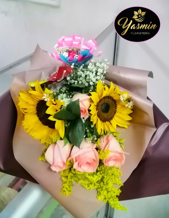 Hermoso arreglo de mano en girasoles, rosas y verdes follajes. Sorprende hoy con este lindo detalle y tarjeta personalizada.