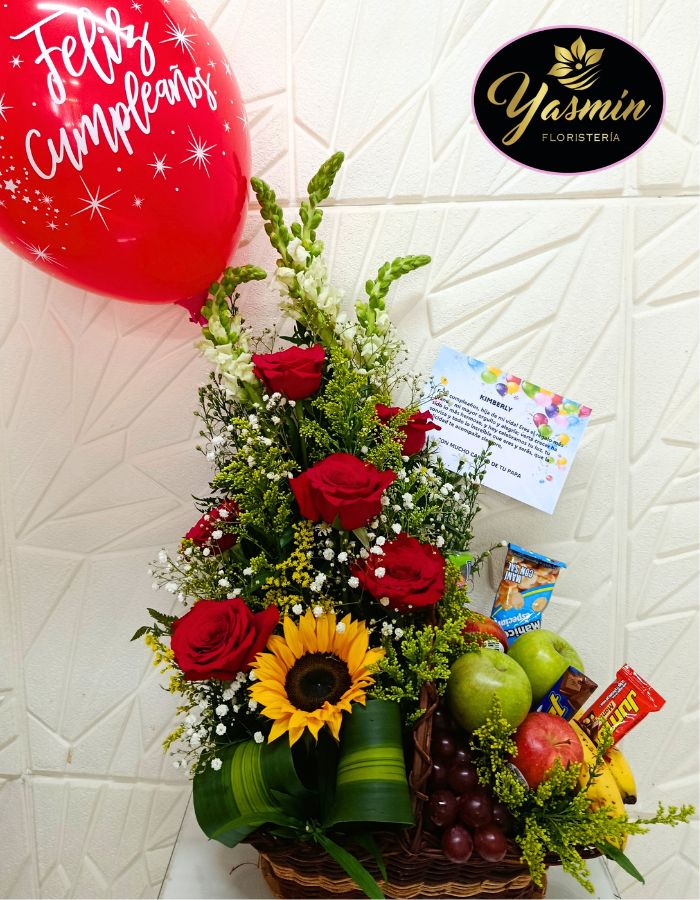 Hermoso arreglo en rosas, frutas, barras de chocolate,, verdes follajes y globo. Es el detalle persfecto para celebrar su día.