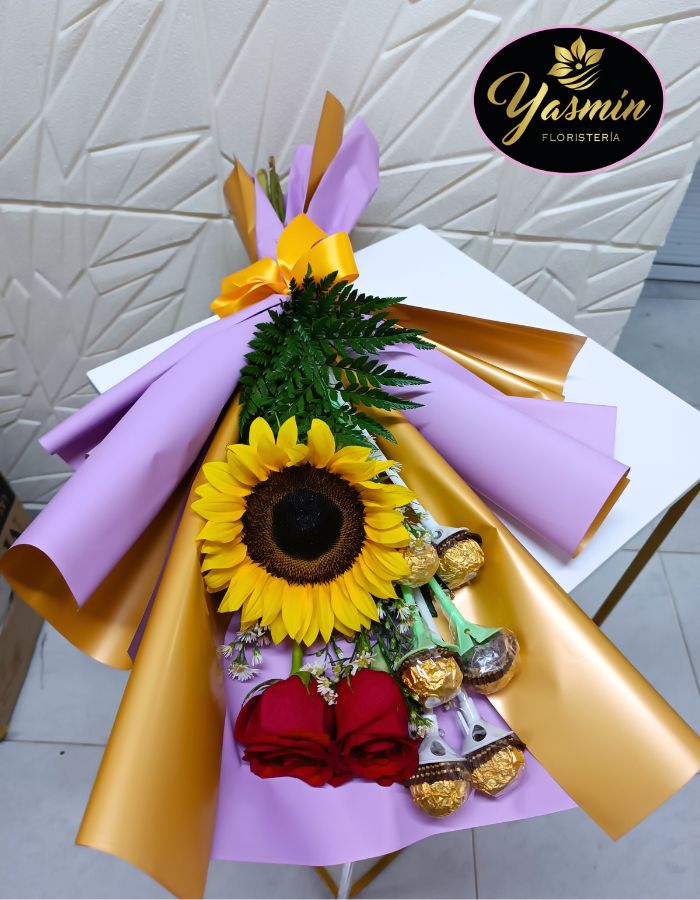 Hermoso arreglo de mano en rosas rojas, girasol y deliciosos chocolates. Haz tu orden y alegra el día de esa persona especial.