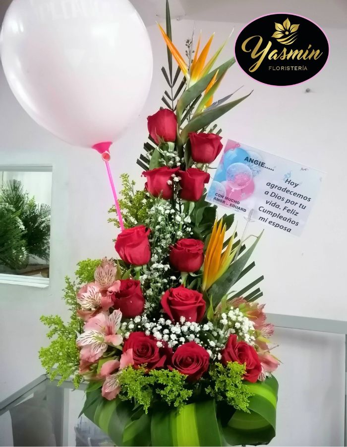 Bello arreglo en rosas rojas y flores rosadas con un globo. Haz tu orden ahora mismo y alegra el día de esa persona especial en tu vida.