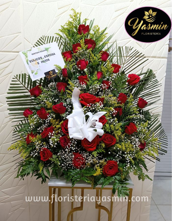 Arreglo fúnebre en rosas rojas y verdes follajes.