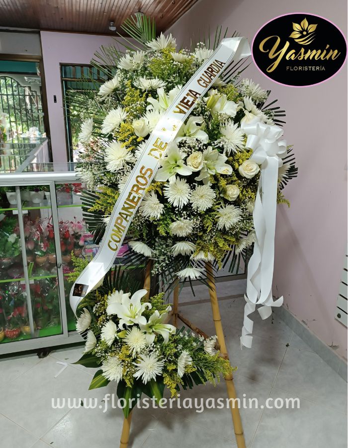 Pedestal fúnebre en flores blancas y verdes follajes.