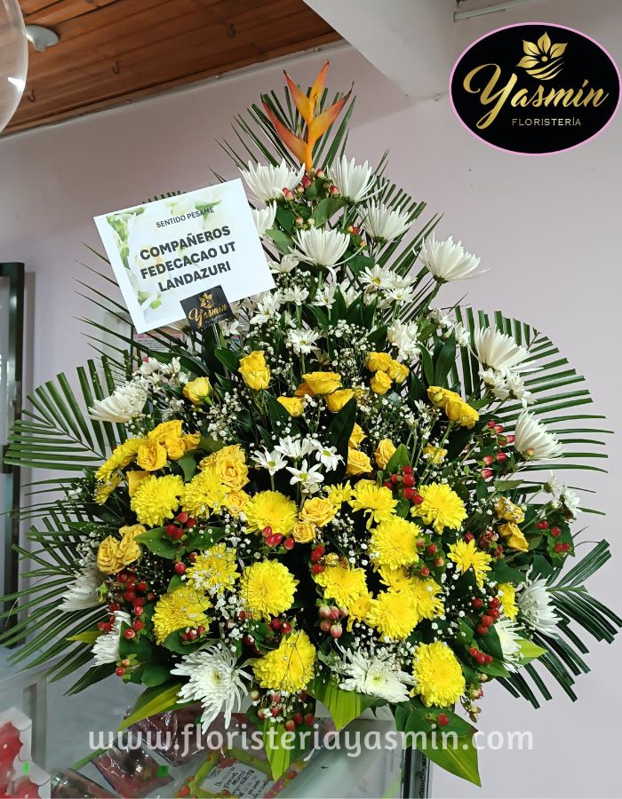 Arreglo fúnebre en flores amarillas y blancas con verdes follajes.