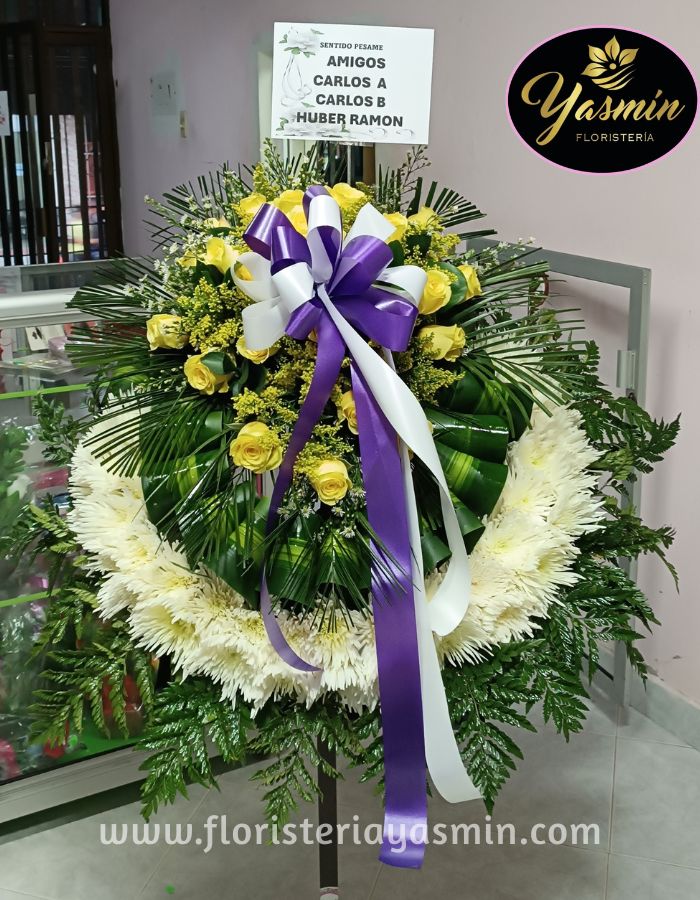Arreglo fúnebre en flores amarillas con verdes follajes.