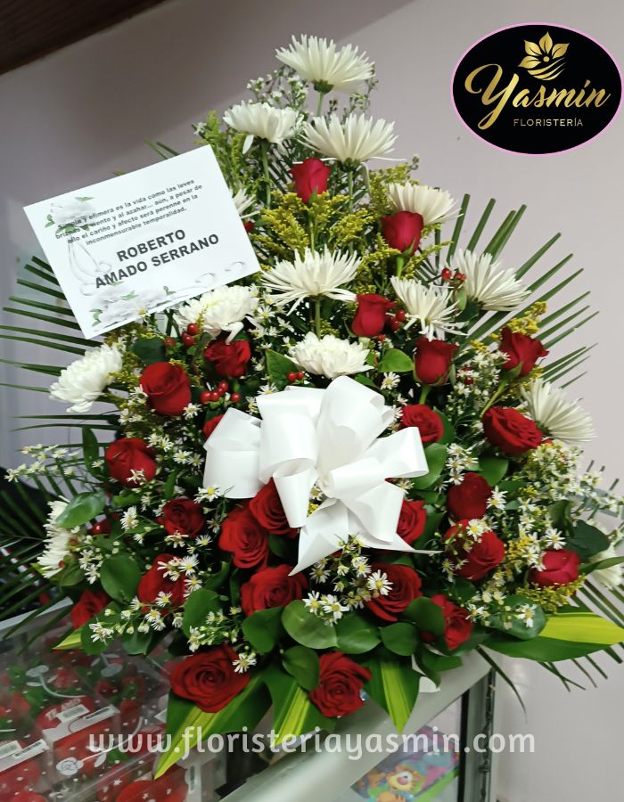 Pedestal en flores blancas, rosas rojas y verdes follajes.