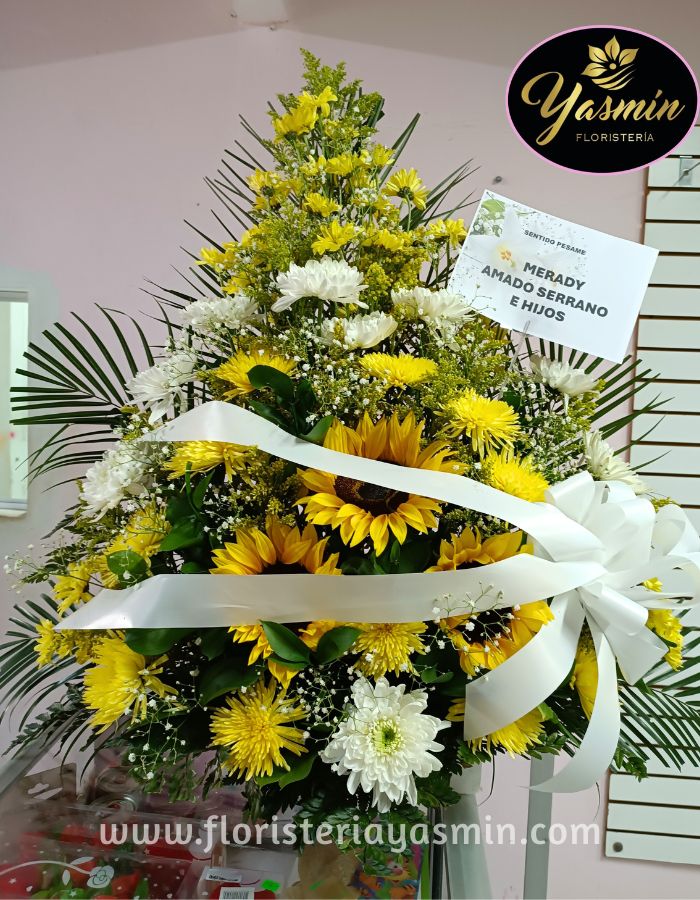 Arreglo fúnebre en girasoles con flores blancas, amarillas y verdes follajes.