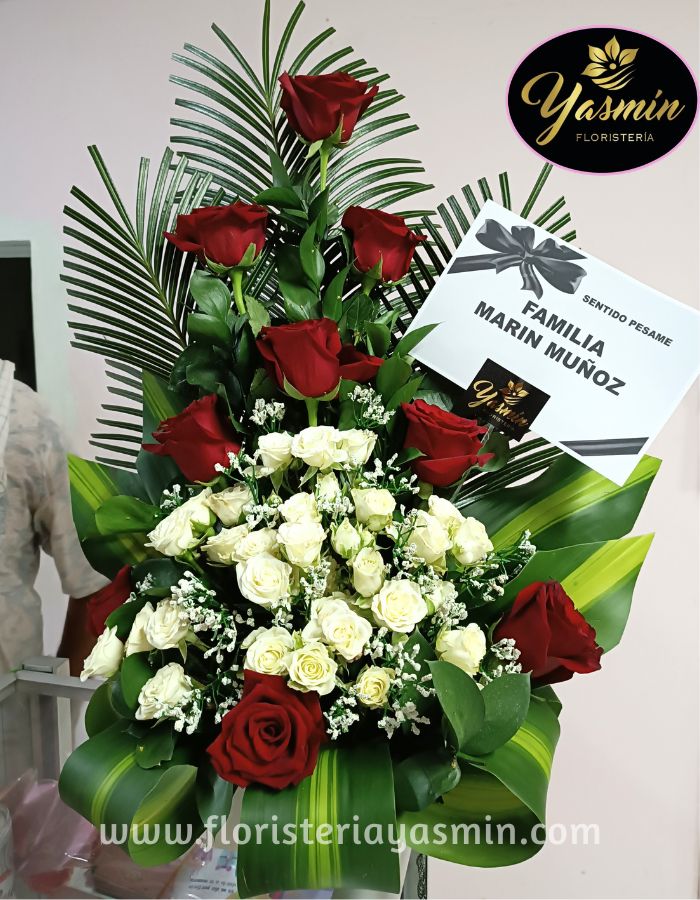 Arreglo fúnebre en rosas rojas y blancas con verdes follajes.