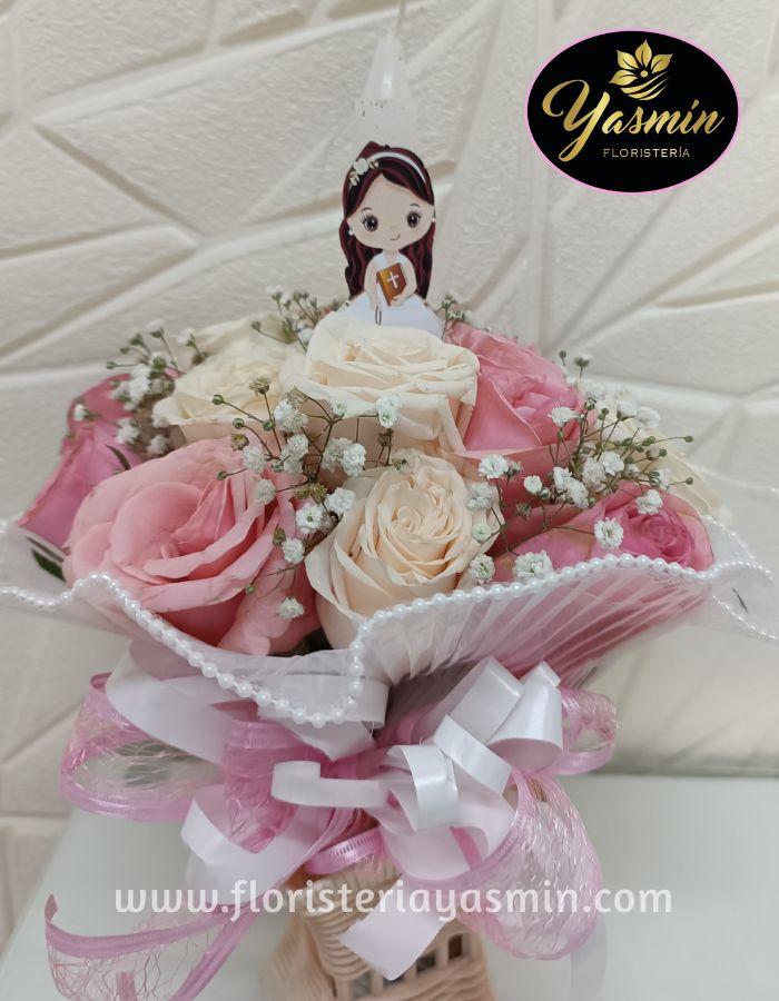 Hermoso arreglo en rosas rosadas y blancas con una veladora.