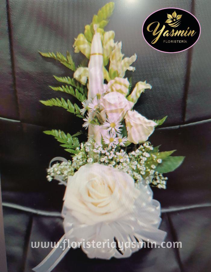 Bello arreglo de mano en rosa blanca con una vela.