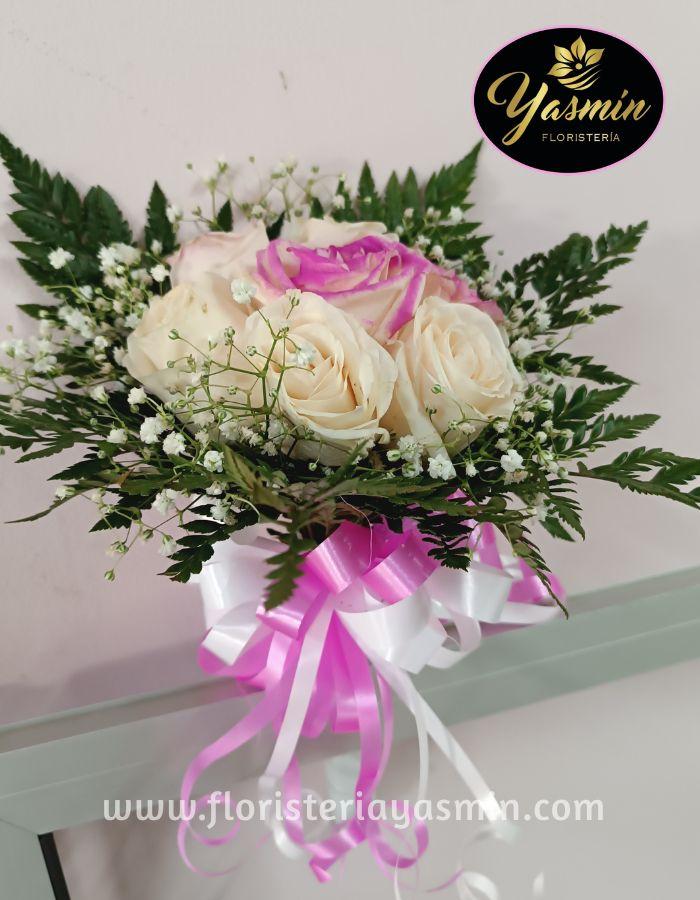 Hermoso arreglo de mano en rosas rosadas y blancas.